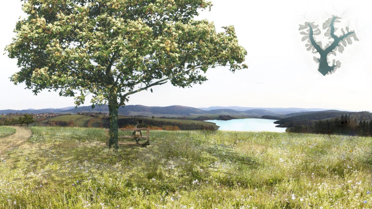 Plánované vodní dílo Vlachovice z vrcholu Vysokého Pole. Vizualizace: Veronika Chalupová[/caption]
