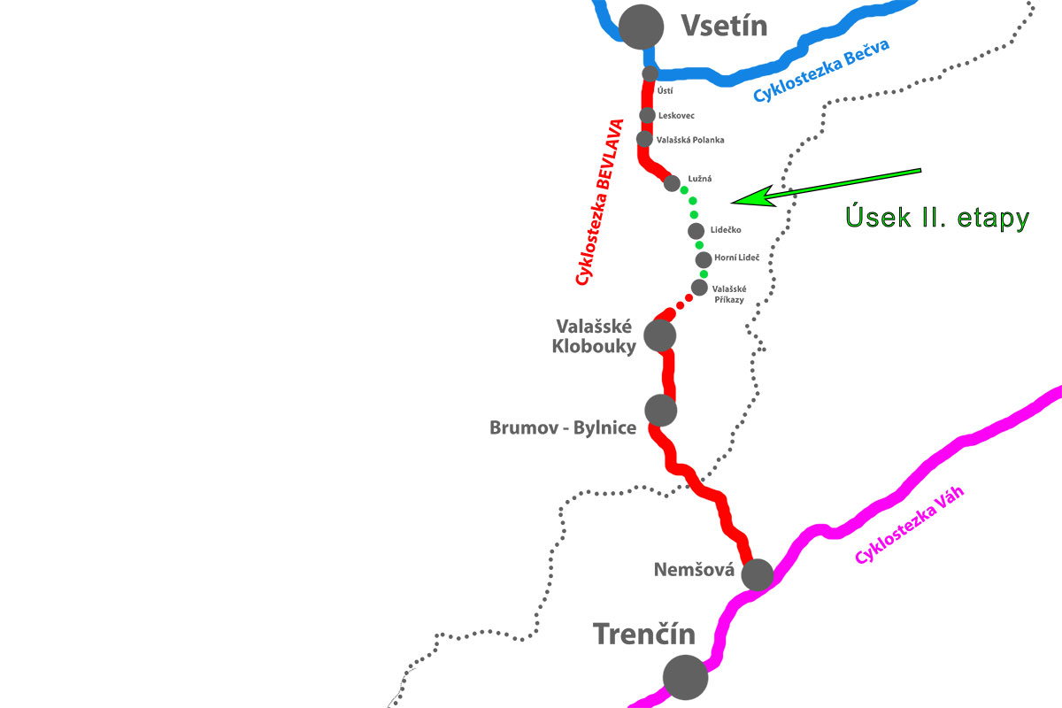 Druhá etapa výstavby cyklostezky Bečva – Vlára – Váh naváže na první etapu dokončenou v loňském roce, na niž kraj poskytnul dotaci 12 milionů korun. Ta zahrnuje úsek od víceúčelového hřiště v Lužné do obce Ústí, kde se napojuje na cyklostezku Bečva. Cyklisté tedy mohou z Ústí pokračovat směrem na Vsetín a Valašské Meziříčí nebo na druhou stranu směrem na Velké Karlovice. [caption id="attachment_125947" align="alignnone" width="1200"]