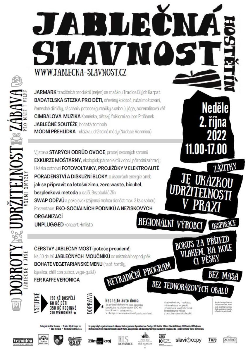 Vůně jablečných moučníků, chuť čerstvého jablečného moštu, jarmark s ukázkami řemesel, netradiční hry pro děti, hudba a především pohoda a dobrá nálada - to vás čeká v Hostětíně v neděli 2. října 2022. Jablečná slavnost přivítá návštěvníky již po devatenácté. Kromě dobré zábavy a vynikajícího vegetariánského občerstvení oceňují hosté i osvětový program akce. Ten jim letos přinese inspiraci a návody k úsporám energie nebo jak na bezodpadovou domácnost (zero waste), ukázku ostrovní fotovoltaiky a také projížďky v elektromobilech. Jablečné soutěže pro dospělé, jóga pro rodiče s dětmi, jóga smíchu či módní přehlídka s ukázkou udržitelné módy jsou jen výčtem z dalšího bohatého doprovodného programu. Na návsi proběhne jarmark regionálních výrobců a po celé odpoledne bude hrát cimbálová muzika. Těšit se můžete i na výstavu více než 50 druhů jablečných moučníků od místních hospodyněk a od cukrářek z Fér Kaffé Veronica. A lákadlem je samozřejmě i čerstvý, právě vylisovaný jablečný mošt z hostětínské moštárny.