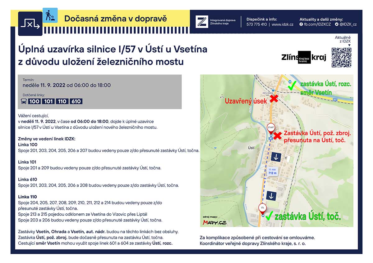 Připomínáme, že z důvodu prací na železničním mostě v Ústí u Vsetína bude v neděli 11. 9. 2022 od 6:00 do 18:00 hod. zcela uzavřen provoz na silnici I/57. Tímto místem neprojedete. Objízdná trasa vede přes Vizovice. Jedná se o druhou plánovanou uzavírku této silnice, ta první proběhla 31. 7. 2022. Úplná uzavírka provozu na silnici I/57 v Ústí – neděle 31 .7. 2022 od 6:00 do 18:00 hod. – neděle 11. 9. 2022 od 6:00 do 18:00 hod. Objížďka pro všechna vozidla bude vedena obousměrně po silnici I/57 křižovatka se silnicí I/49 Valašská Polanka, silnici I/49 křižovatka se silnicí I/69 Vizovice, silnici I/69 křižovatka se silnicí I/57 Vsetín, silnici I/57 Ústí, okr. Vsetín a okr. Zlín. Částečná uzavírka provozu na silnici I/57 v Ústí – od 31. 7. 2022 do 30. 9. 2022 – doprava bude řízena kyvadlově