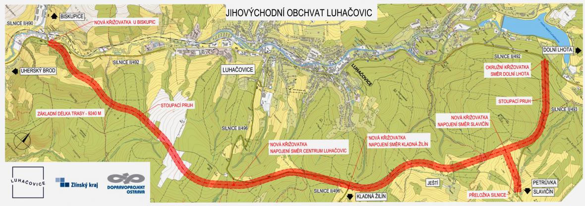 Signatáři se podpisem deklarace zavázali k tomu, že budou aktivně řešit případné problémy spojené s přípravou a stavbou obchvatu a společně budou upřesňovat časové posloupnosti jednotlivých kroků a rozdělení úkolů. Vznikne pracovní skupina složená ze zástupců Zlínského kraje a dotčených měst a obcí, kteří budou společně vyhodnocovat postup přípravy, včetně zanesení záměru do územních plánů, nebo přípravu souvisejících záměrů, například dopravního terminálu Biskupice. Obchvat v délce téměř 10 kilometrů by měl začínat u křižovatky u Biskupic, na druhé straně se napojí na okružní křižovatku nad Luhačovickou přehradou. Ve stoupání a klesání mezi přehradou a Petrůvkou by měl mít dva pruhy v každém směru. [caption id="attachment_160946" align="alignnone" width="1180"]