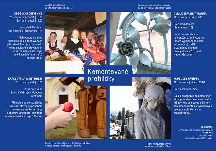 Sezóna letních dovolených, výletů, výšlapů a procházek je právě na svém startu. Už víte, kam se o prázdninách vydáte? Co třeba vyrazit do Valašských Klobouk za zážitky, přírodou nebo památkami a své cesty obohatit o některou ze série komentovaných prohlídek? Letos návštěvníky opět povedou do historických objektů, které nejsou veřejnosti běžně otevřené, a přidají také jedno nové místo. Tak se nechejte pozvat a vejděte s průvodcem do klobouckých dřevěnic, do kaple svatých Cyrila a Metoděje nebo do domu Josefa Bratmanna. Můžete si také přijít poslechnout příběh klobouckého hřbitova a osobností, které jsou tu pohřbeny.
