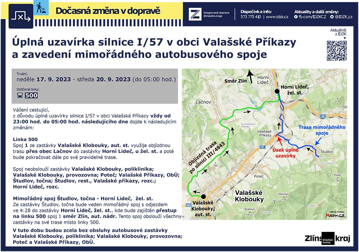 Uzavírka v termínu 17. - 20. září 2023 (do 5.00 hodin) se dotkne provozu autobusové linky 500. Spoj 1 ze zastávky Valašské Klobouky, autobusová stanice využije objízdnou trasu přes obec Lačnov do zastávky Horní Lideč, u železniční stanice a poté bude pokračovat dále po své pravidelné trase. Spoj neobslouží zastávky Valašské Klobouky, poliklinika; Valašské Klobouky, provozovna; Poteč; Valašské Příkazy, obecní úřad; Študlov, točna; Študlov, restaurace, Valašské příkazy, rozcestí; Horní Lideč, rozcestí.Mimořádný spoj Študlov, točna - Horní Lideč, železniční stanice