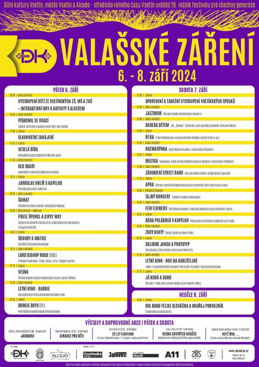 Víkend plný pestrého kulturního programu pro celou rodinu přinese opět po roce multižánrový festival Valašské záření. Dvě pódia v centru Vsetína budou po tři dny patřit regionálním umělcům i známým hudebníkům z celé ČR. Chybět nebude ani tradiční doprovodný program připravovaný ve spolupráci s místními organizacemi a spolky. Mezi desítkami umělců se o víkendu 6. až 8. září představí mimo jiné Bára Poláková, Dalibor Janda nebo Vesna. Program za finanční podpory města Vsetín připravuje Dům kultury Vsetín a Alcedo – středisko volného času a plavecká škola Vsetín.