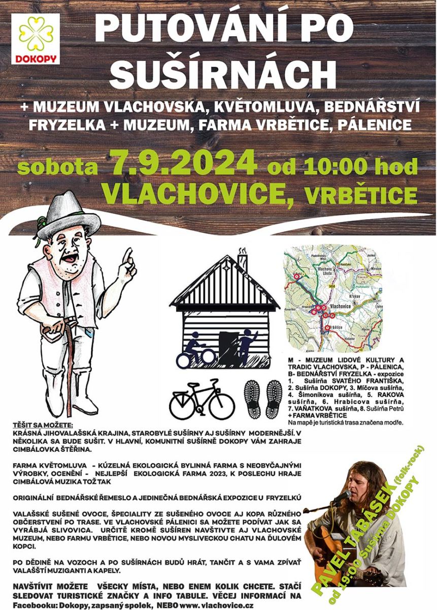 Tuto sobotu 7. 9. 2024 se ve Vlachovicích uskuteční výjimečná akce Putování po sušírnách a dalších zajímavých místech v obci. Ve Vlachovicích již spousta sušíren zanikla, ještě před 70 lety jich ale ve Vlachovicích a Vrběticích bylo 25. Posledních osm dřevěných sušíren je rozesetých po vysokých stráních a sadech. Díky majitelům a spolku DOKOPY se již ve čtyřech z nich suší! Obec Vlachovice má nejvíce opravených a funkčních sušíren ovoce z celé ČR i SR. Sušení ovoce bylo ve Vlachovicích do první třetiny 20. stol. bráno jako důležitý způsob místní obživy a někdy i jako náhrada chleba. Sušené ovoce se z Vlachovska vyváželo běžně po celé Moravě a Rakousku-Uhersku.