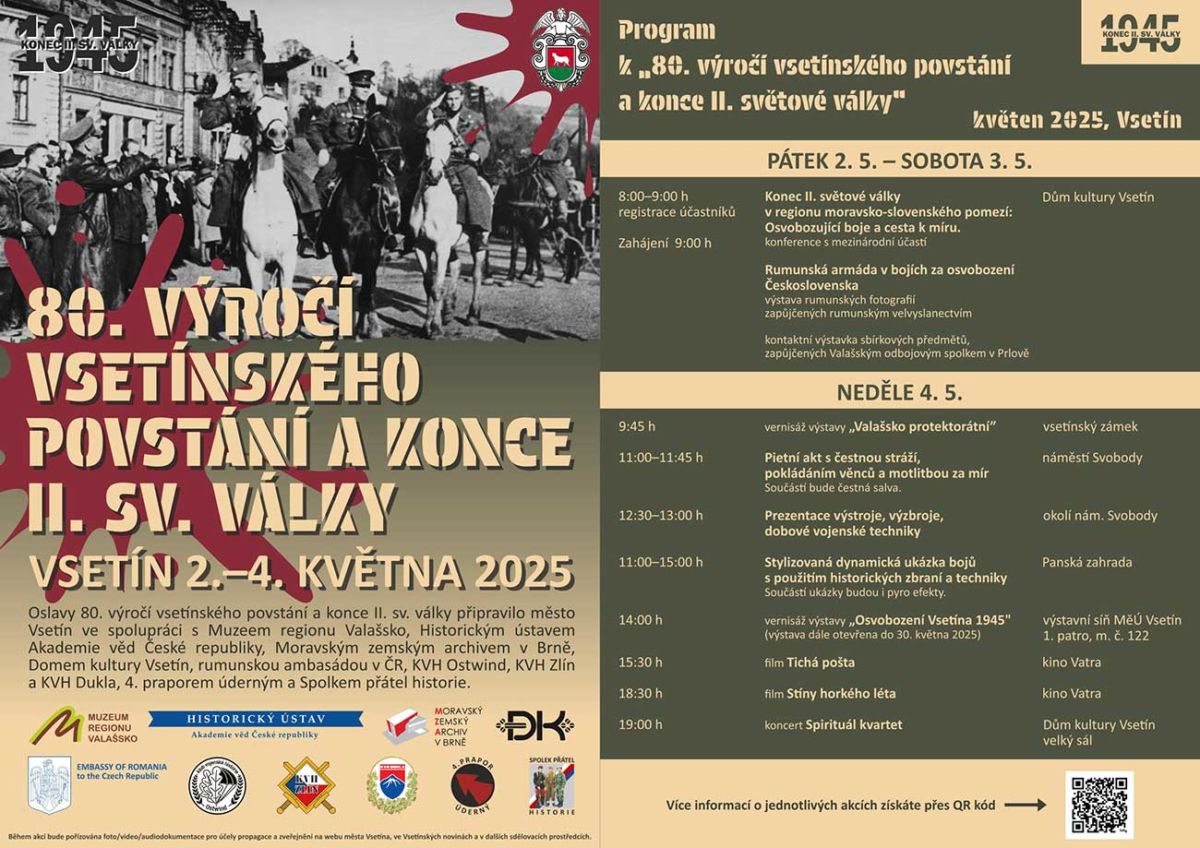 Pátek 2. 5. – Sobota 3. 5. 9:00 – Konec 2. světové války a osvobození v regionu moravsko-slovenského pomezí (konference) – Malý sál DK (Registrace účastníků od 8 hodin) - program konference naleznete v příloze Rumunská armáda v bojích za osvobození Československa (výstava fotografií) – Foyer DK Kontaktní výstava sbírkových předmětů – Před malým sálem DK Neděle 4. 5. 9:45 – Valašsko protektorátní (vernisáž výstavy) – Zámek 11:00 – 11:45 Pietní akt s čestnou stráží – Náměstí Svobody (součástí bude čestná salva) 11:00 – 15:00 Stylizovaná dynamická ukázka bojů s použitím historických zbraní a techniky – Panská zahrada 12:30 – 13:00 Prezentace dobové vojenské výstroje, výzbroje a techniky – okolí náměstí Svobody 14:00 Osvobození Vsetína 1945 (vernisáž výstavy) – výstavní síň MěÚ (1. patro, do 30. 5. 2025) 15:30 Tichá pošta (film) – Kino Vatra 18:30 Stíny horkého léta (film) – Kino Vatra 19:00 Spirituál kvartet–(koncert) – Velký sál DK Odkazy Oslavy výročí-kompletní program [JPG, 1 MB] Pietní akt náměstí Svobody [PDF, 4,2 MB] Pozvánka konference [PDF, 2,2 MB] Program konference [PDF, 1,8 MB] Valašsko protektorátní-plakát k výstavě [JPG, 304 kB] Výstava Osvobození Vsetína městský úřad [JPG, 916 kB] Výstava Rumunská armáda v bojích za osvobození Československa [JPG, 963 kB] -tz-