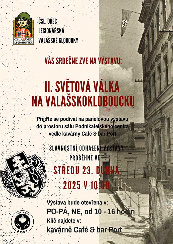 - od 23. dubna 2025 Československá obec legionářská ve Valašských Kloboukách zve na výstavu II. světová válka na Valašskokloboucku, která je určena jak pro širokou veřejnost, tak i školy. Vstup je zdarma. Slavnostní odhalení výstavy proběhne ve středu 23. dubna 2025 v prostorách sálu Podnikatelského centra vedle kavárny Café & bar Port. Výstava bude otevřena v PO-PÁ, NE vždy od 10:00 do 16:00 (pokud v sále nebude soukromá akce). Klíč od sálu bude vždy na vyžádání v kavárně. Můžete si dát vynikající kávu a brouzdat se zájmem nedávnou historií našeho regionu. Od konce II. světové války letos uplyne 80 let, proto neváhejte a připomeňte si s námi nejvýraznější mezníky války, příslušníky odboje, partyzány, Obranu národa, statečné letce, rodinu Josefa Valčíka či tragické perzekuce z řad okupantů. Návštěvník získá povědomí také o osvobození regionu Rumunskou královskou armádou. Výstava je bohatá nejen na fotografie a popisky, ale poskytuje především základní informace a zajímavosti k jednotlivým tématům. Je tedy vhodná i pro školní děti jako doplněk učiva k II. světové válce s přihlédnutím na regionální dějiny.