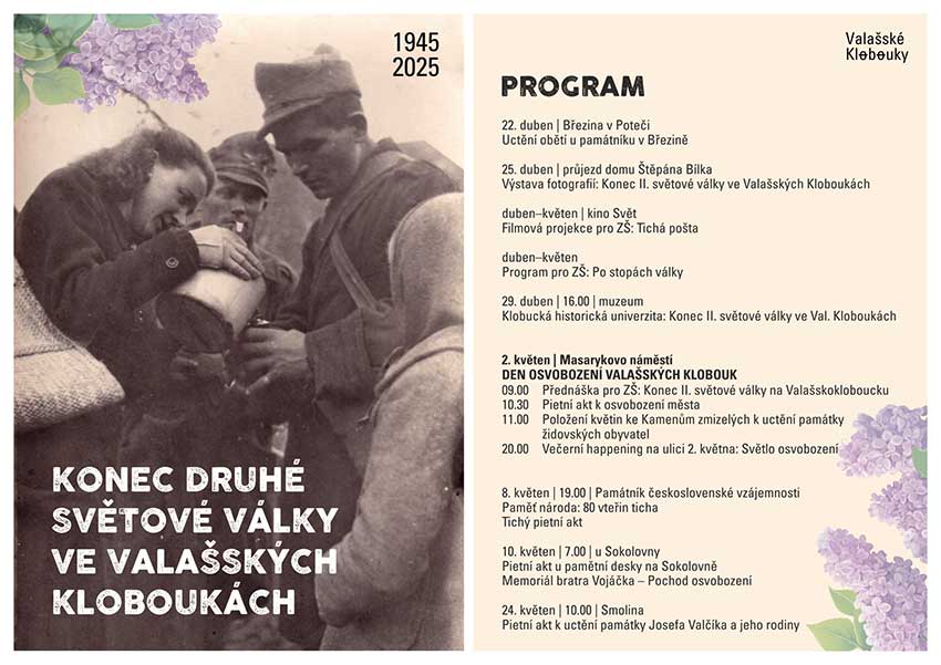 Pietními akty, přednáškami, výstavou fotografií i programem pro školy si ve Valašských Kloboukách připomeneme události, které před osmdesáti lety provázely ukončení druhé světové války. Město bylo osvobozeno rumunskými vojsky 2. května, a proto budou hlavní okamžiky směřovány k tomuto datu. Uskuteční se pietní akt u Památníku československé vzájemnosti, u Kamenů zmizelých uctíme památku židovských obyvatel, kteří zahynuli v koncentračních táborech, a večer proběhne na ulici 2. května happening Světlo osvobození. Na tyto i další události z bohatého programu jsou všichni občané srdečně zváni.