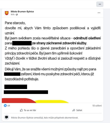 Na oficiální facebookové stránce města Brumov-Bylnice se v uplynulých dnech objevil příspěvek, který obsahoval dopis adresovaný starostovi města. V textu dopisu mimo jiné autor popisuje situaci, kdy podle jeho slov mělo dojít k odmítnutí ošetření jistého pána ze strany záchranné zdravotní služby.
