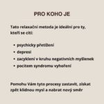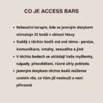 Access Bars navíc působí na psychiku – uvolňuje napětí, pomáhá při depresích a úzkostech a přináší hluboký odpočinek. „Vaším jediným úkolem je lehnout si, zavřít oči a uvolnit se. O zbytek se postará tělo samo,“ dodává paní Wichtorová.