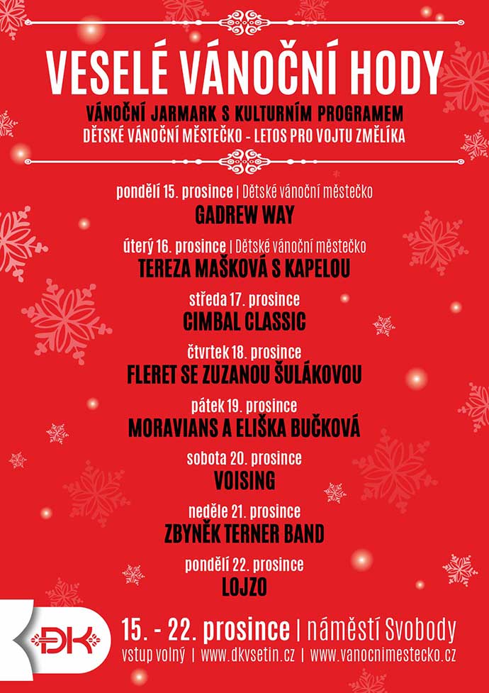 Veselé vánoční hody v centru Vsetína žijí hudbou, zábavou i vůní vánočních dobrot. Předvánoční program začal v pondělí 15. prosince na náměstí Svobody a potrvá až do úterý 23. prosince. Každý den se návštěvníci mohou těšit na vánoční jarmark (plátěné stánky s tradičním zbožím budou k dispozici od pondělí 15. do pátku 19. prosince), vystoupení regionálních souborů i známých interpretů. Vyvrcholením adventního dění bude v předvečer Štědrého dne tradiční Zpívání koled se souborem Vsacan na Dolním náměstí. Akci pořádá Dům kultury Vsetín ve spolupráci s městem Vsetín.