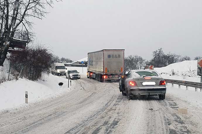 S rozbředlým sněhem na silnicích mají většinou problémy kamiony. Jeden například uvázl v kopci u Horní Lidče, než se mu podařilo ze zatáčky vycouvat, tak zablokoval jeden jízdní pruh. Podobná situace byla v Jestřabí, ve Vlachovicích, mezi Svatým Štěpánem a Sidonií. Havarovaný nákladní vůz hasiči vyprošťovali u Petrůvky. Zdolat zasněžený kopec měly kamiony také u hraničního přechodu Střelná.