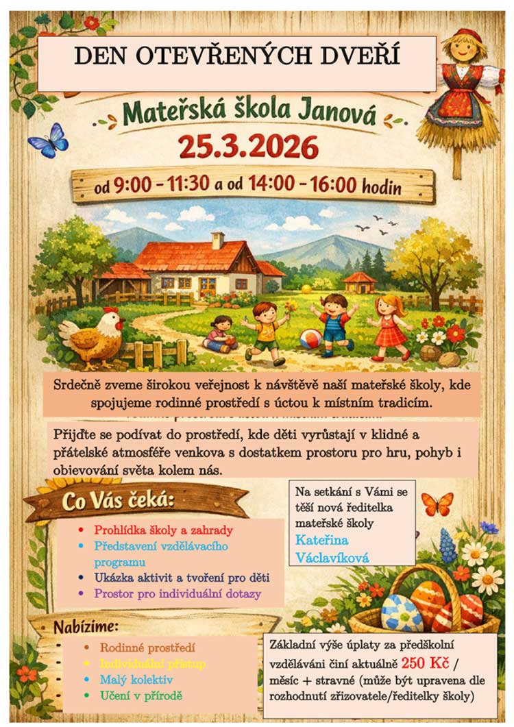 I proto zve nová ředitelka všechny rodiče, děti a vůbec všechny, které to zajímá na velký Den otevřených dětí, který bude probíhat 25. 3. 2026 ve dvou vlnách, od 9:00 do 11:30 a od 14:00 do 16:00 hod. Součástí dne bude ukázka aktivit a tvoření pro děti, prohlídka školy a zahrady, představení vzdělávacího programu a samozřejmě osobní dotazy. Všichni jste srdečně zváni!