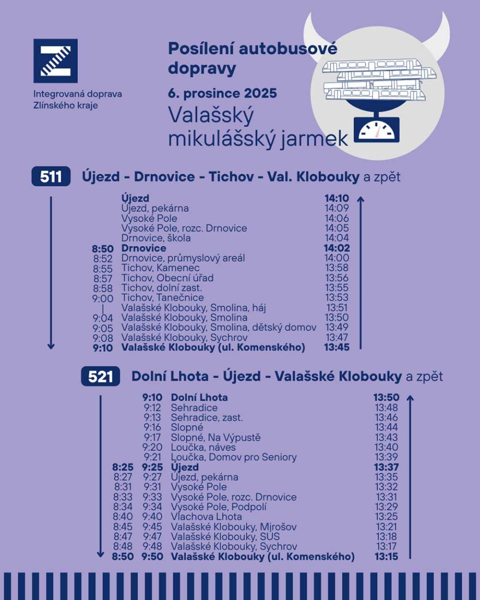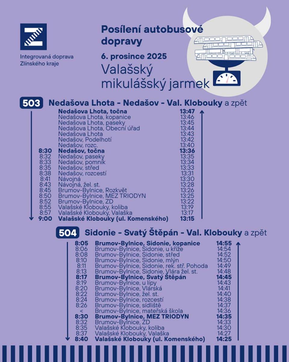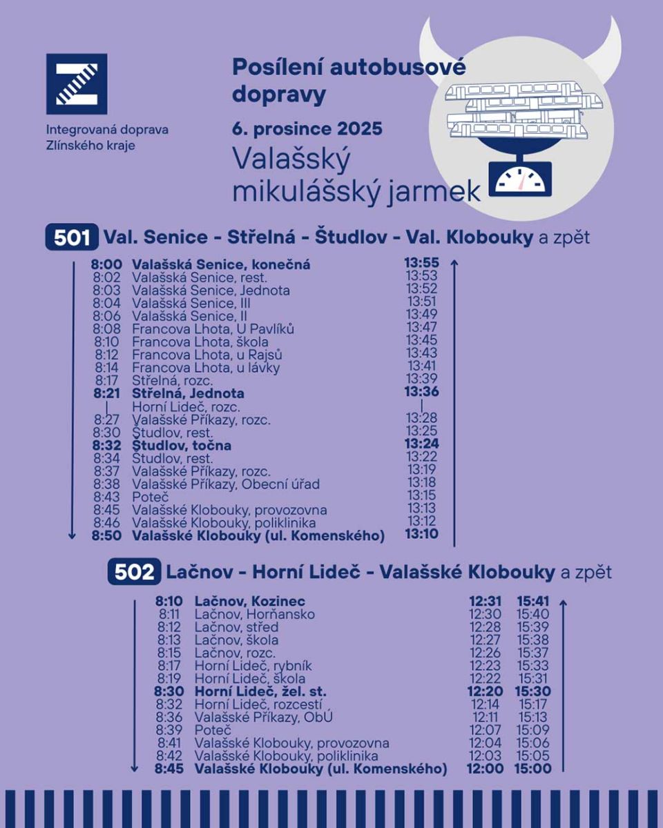 Z celého regionu se na Valašský mikulášský jarmek můžete sjet posílenými autobusovými i vlakovými spoji. Zde najdete přehled těchto mimořádných jízdních řádů.