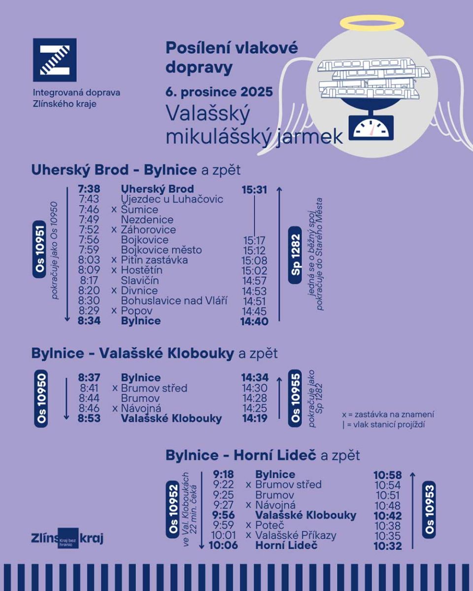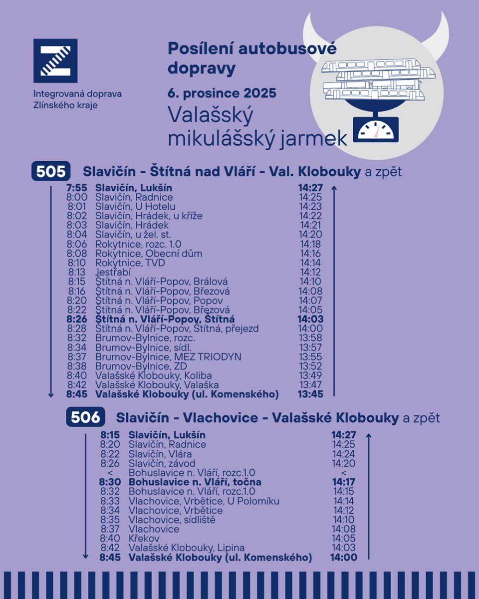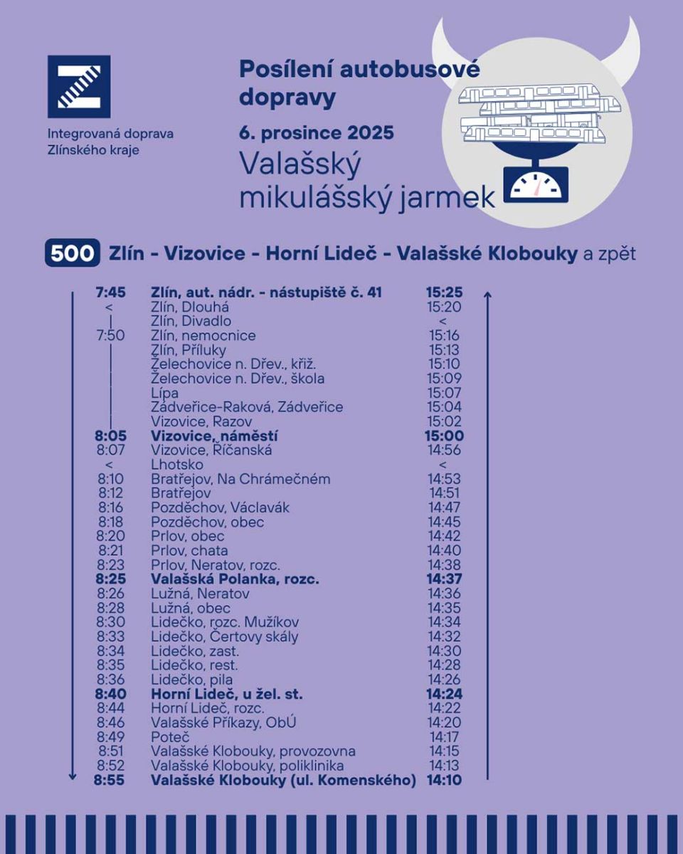 Z celého regionu se na Valašský mikulášský jarmek můžete sjet posílenými autobusovými i vlakovými spoji. Zde najdete přehled těchto mimořádných jízdních řádů.