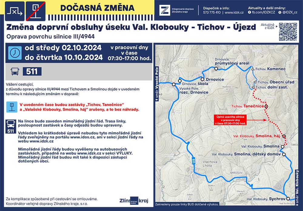 Kvůli stavebním pracem budou zrušeny autobusové zastávky „Tichov, Tanečnice“ a „Valašské Klobouky, Smolina, háj“. Na lince 511 bude zaveden mimořádný jízdní řád, který najdete zde.
