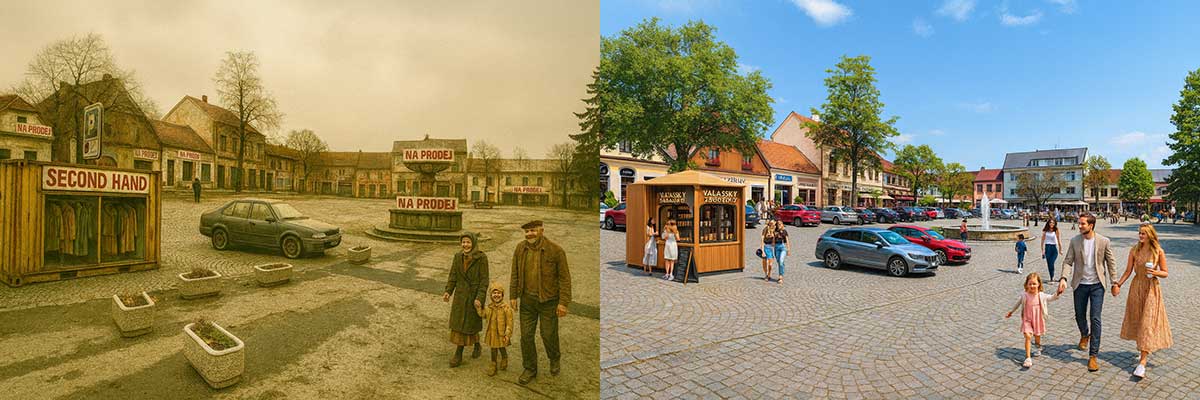 Proti tomu Klobouky budou dále pár let přešlapovat. Krásné nové náměstí, cykloboxy, pěšinky. Obyvatelé budou stárnout, mladí budou ještě víc odcházet. Každý uzavřený obchod, každá prázdná nebo zazděná výloha podél hlavní cesty (opět smutná každodenní realita procházek centrem) přeměněná v levné ubytování město víc a víc tlačí na hranu propasti zvané periferie. Bude přibývat levné módy, sekáčů, prodejen potravin před exspirací, cena starších nemovitostí bude klesat nebo neporoste tak, jako v okolí, budou se hůř prodávat, časem je třeba začnou skupovat obchodníci s chudobou. Velký dům ze 70. let Vašeho souseda (typicky se to může třeba týkat kdysi výstavní vilové čtvrti Rybníčky) už jeho děti nebudou chtít draze rekonstruovat, protože tady nemají vazby, práci, vztahy. Když ho rok, dva neprodají, pod cenou skončí u někoho, kdo ho přestaví na malinkou bytovku, pouhé 3 byty a 2 nebytové prostory pro 7 rodin. Hodnota okolních nemovitostí padá, problém roste exponenciálně. Tak vzniká „vyloučená lokalita“. Zavírají restaurace, přibývají nálevny. Večer nebude kam vyrazit, bude přibývat drobné kriminality.