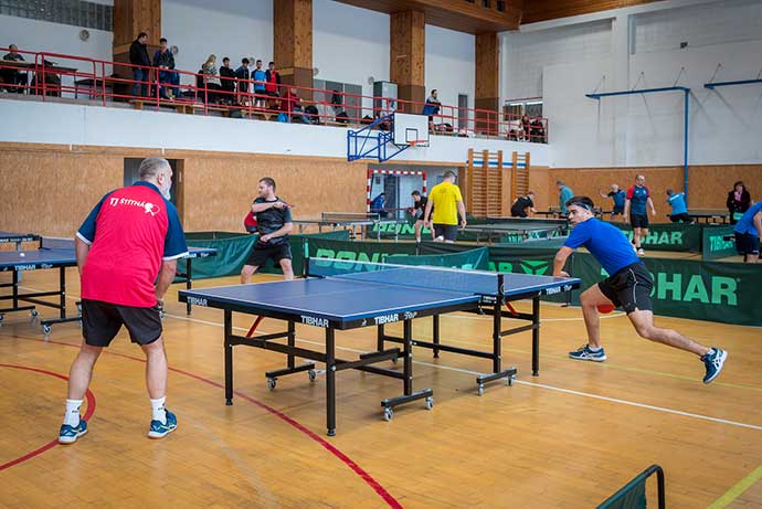 Zápasy ve dvouhře mužů a čtyřhře mužů se ve sportovní hale ve Slavičíně hrály na 16 stolech.