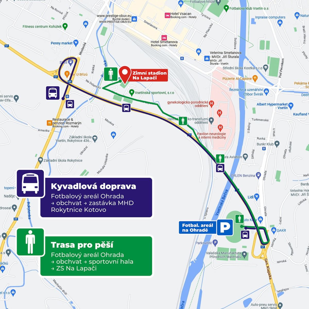 - Stejně jako minulou sezonu, také v sobotu nebude možné u Lapače z organizačních a bezpečnostních důvodů parkovat. Klub VHK ROBE Vsetín ve spolupráci s městem Vsetín zajistil záchytné parkoviště ve fotbalovém areálu na Ohradě a také autobusovou dopravu, která bude mezi Ohradou a Lapačem jezdit. První autobus vyrazí z Ohrady v sobotu v 16:00, druhý v 16:20. Po zápase pak autobus odjíždí na Ohradu přesně 20 minut po závěrečném hvizdu ze zastávky v Rokytnici naproti čerpací stanici Shell. Existuje také možnost dojít z Ohrady na Lapač pěšky. Žádáme fanoušky, aby se Lapači vozem v sobotu vyhnuli a nenastaly tak dopravní komplikace na hlavní komunikaci. Zvlášť v aktuálním období, kdy v okolí ZS se uskutečňuje hned několik dopravních omezení z důvodů prací na silnici, výstavba železniční stanice atd. Omezení neplatí pro hokejové týmy a obsluhu utkání (pořadatelská služba, policie, záchranka...).