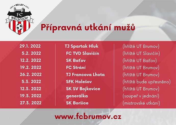 V pátek 7. 1. 2022 zahájili muži FC Brumov zimní přípravu. Trenér Martin Kolář do přípravy zapojí cca 20 hráčů a k nim by se mělo přidat trio šikovných dorostenců (Fojtík, Běhunčík a Šánek). Muži budou mít v lednu tři tréninkové jednotky týdně (středa, pátek a sobota).
