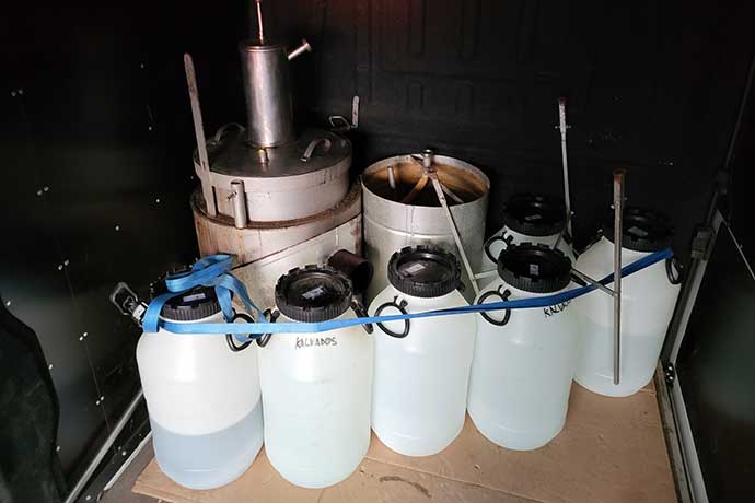 arrow_drop_up Celníci zajistili 260 litrů lihu a kompletní zařízení sloužící k výrobě alkoholu. Foto: Celní správa