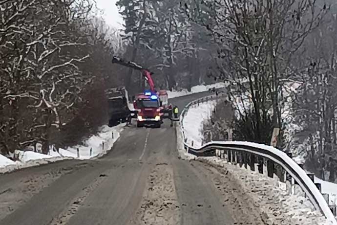 S rozbředlým sněhem na silnicích mají většinou problémy kamiony. Jeden například uvázl v kopci u Horní Lidče, než se mu podařilo ze zatáčky vycouvat, tak zablokoval jeden jízdní pruh. Podobná situace byla v Jestřabí, ve Vlachovicích, mezi Svatým Štěpánem a Sidonií. Havarovaný nákladní vůz hasiči vyprošťovali u Petrůvky. Zdolat zasněžený kopec měly kamiony také u hraničního přechodu Střelná.