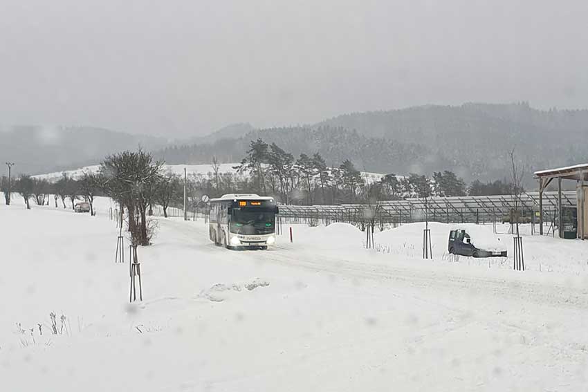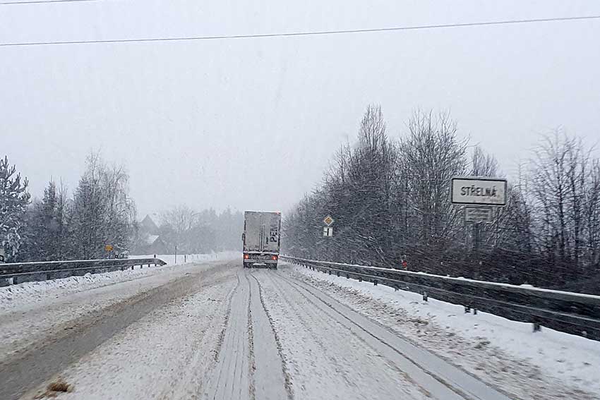 S rozbředlým sněhem na silnicích mají většinou problémy kamiony. Jeden například uvázl v kopci u Horní Lidče, než se mu podařilo ze zatáčky vycouvat, tak zablokoval jeden jízdní pruh. Podobná situace byla v Jestřabí, ve Vlachovicích, mezi Svatým Štěpánem a Sidonií. Havarovaný nákladní vůz hasiči vyprošťovali u Petrůvky. Zdolat zasněžený kopec měly kamiony také u hraničního přechodu Střelná.