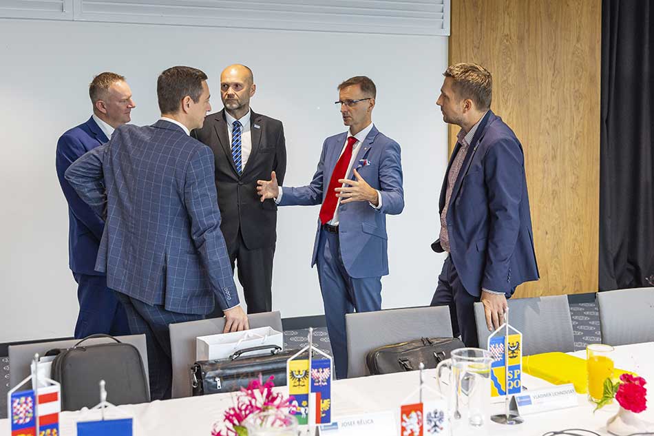 Odpoledne se k českým hejtmanům připojili jejich slovenští kolegové ze sdružení Samosprávne kraje Slovenska (SK8) a společně diskutovali hlavně o možnostech přeshraniční spolupráce. Debata se zaměřila na praktické oblasti, kde mohou české a slovenské regiony intenzivně spolupracovat. Patří k nim například koordinace dopravních spojů a možnost cestování na jednu jízdenku v obou zemích, napojení dálniční a cyklistické infrastruktury, ale i spolupráce složek integrovaného záchranného systému, fungování letecké záchranné služby nebo zjednodušení podmínek čerpání prostředků z evropských fondů. Hovořilo se také o Evropském hlavním městě kultury 2026, jímž bude slovenský Trenčín, školských projektech či decentralizaci veřejné správy.