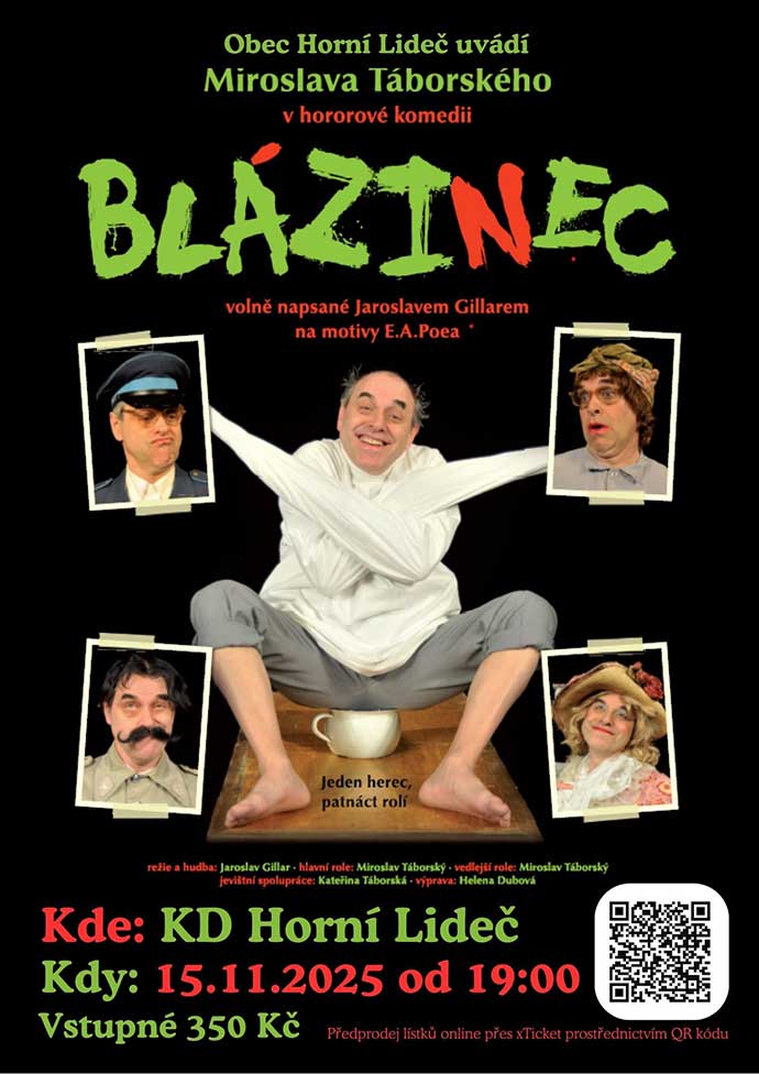 V sobotu 15. listopadu se v KD Horní Lideč uskuteční divadelní představení Blázinec, ve kterém se ve všech patnácti !! rolích představí právě Miroslav Táborský.