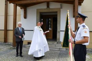 Před kostelem již čekala vyhrávající hrozenkovská dechovka a jen co se průvod dostavil na prostranství u kostela, přišel hasiče pozdravit místní farář Dušan Šimala. Vlajkonoš Matěj Valíček se postavil s praporem před kříž u kostela a ostatní se rozestavili v několika řadách kolem prostranství. Farář Šimala všechny přivítal a vyzdvihl poslání dobrovolných hasičů, kteří se rozhodli pomáhat svým bližním, jak mají ostatně uvedeno na svém praporu: Bohu ke cti, bližnímu ku pomoci, vlasti ku prospěchu. Poté posvětil prapor, přítomné hasiče i hudebníky a na závěr všem požehnal. Následně se všichni přesunuli naproti kostela do lidového domu k dalšímu slavnostnímu programu.