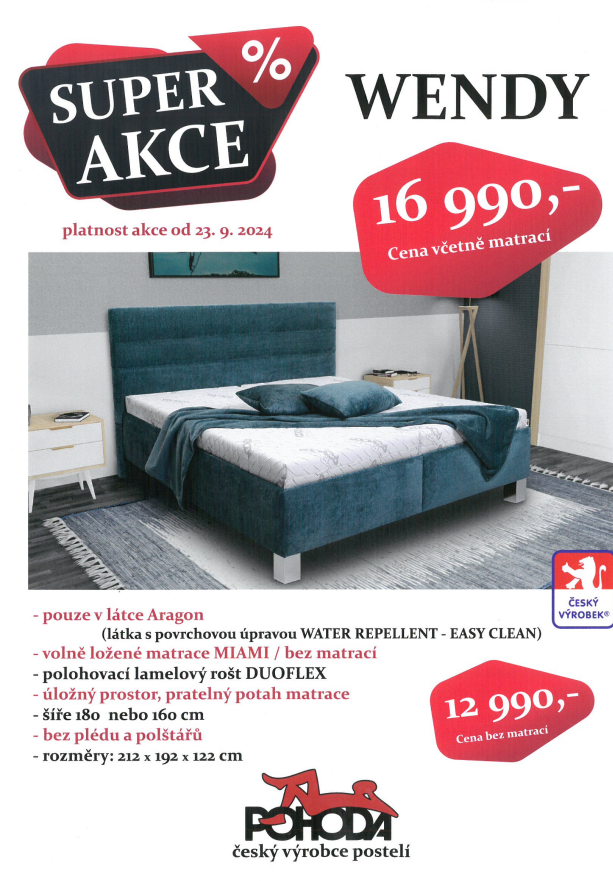Nejprodávanější postel? ---> WENDY. Čalouněná postel české výroby. Šíře lůžka 160 nebo 180 cm. Součástí postele jsou úložné prostory a polohovací rošty. Akční látka s povrchovou úpravou WATER ...