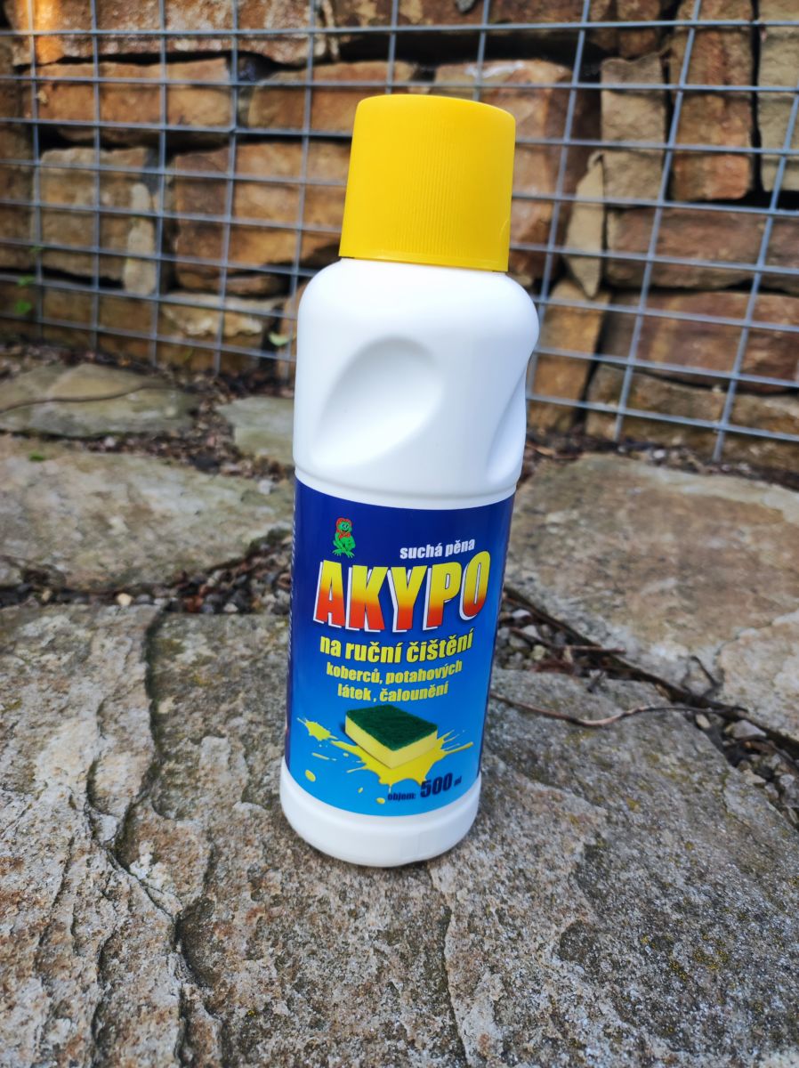 Akypo suchá pěna - přípravek na ruční čištění koberců a čalouněného nábytku. Roztok se napění a pěna se nanáší houbou nebo kartáčem na čištěnou plochu předem zbavenou mechanických nečistot. Po zasc...