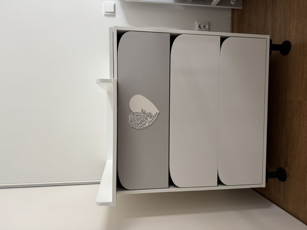 Komoda má 3 výsuvné zásuvky se zaoblenými rohy. Shora je nasazen přebalovací nástavec. Rozšířeno o úložný prostor zprava (š 25 cm po celé hloubce 60 cm -nevzniká odskok od stěny). Přimontovány nové nožky (+14 cm).