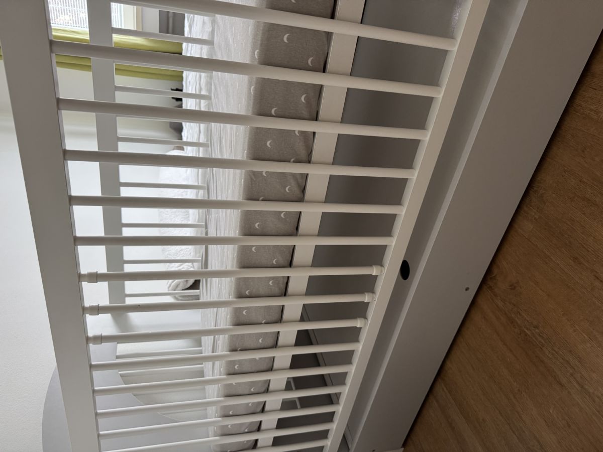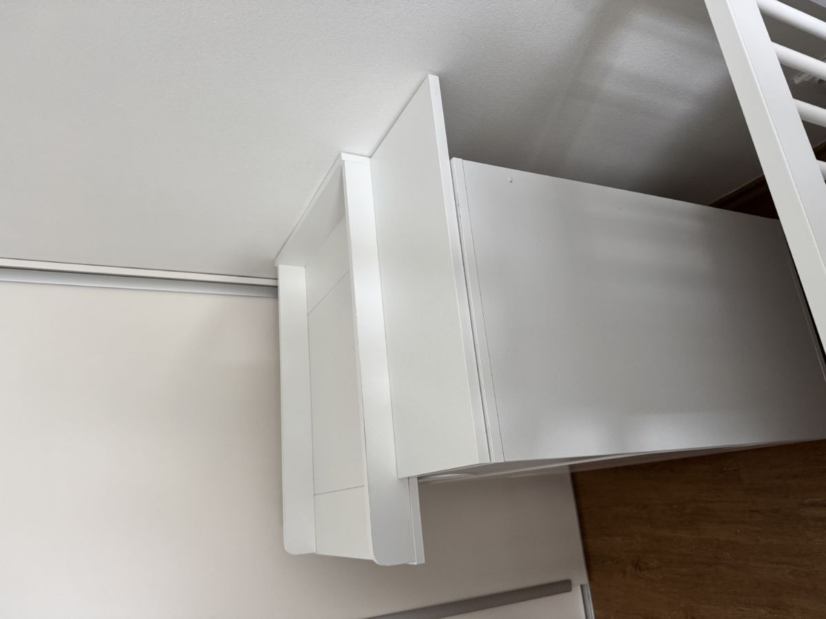 Postýlka i komoda mají minimální odřeniny odpovídající běžnému užívání. U komody se mj. při montáži podařilo navrtat vrut sešikma, tedy trochu zasahuje do pohledové strany.