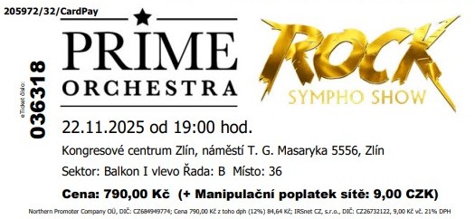 Prodám 2ks lístků na koncert Prime Orchestra – Rock sympho show. Ve Zlíně 22.11.2025. Více info a původní cena v příloze. Nová cena dle dohody.