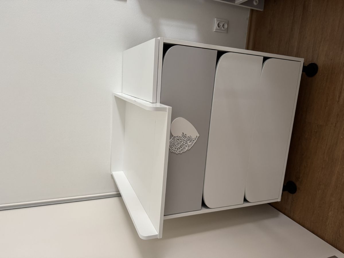 Komoda má 3 výsuvné zásuvky se zaoblenými rohy. Shora je nasazen přebalovací nástavec. Rozšířeno o úložný prostor zprava (š 25 cm po celé hloubce 60 cm -nevzniká odskok od stěny). Přimontovány nové...