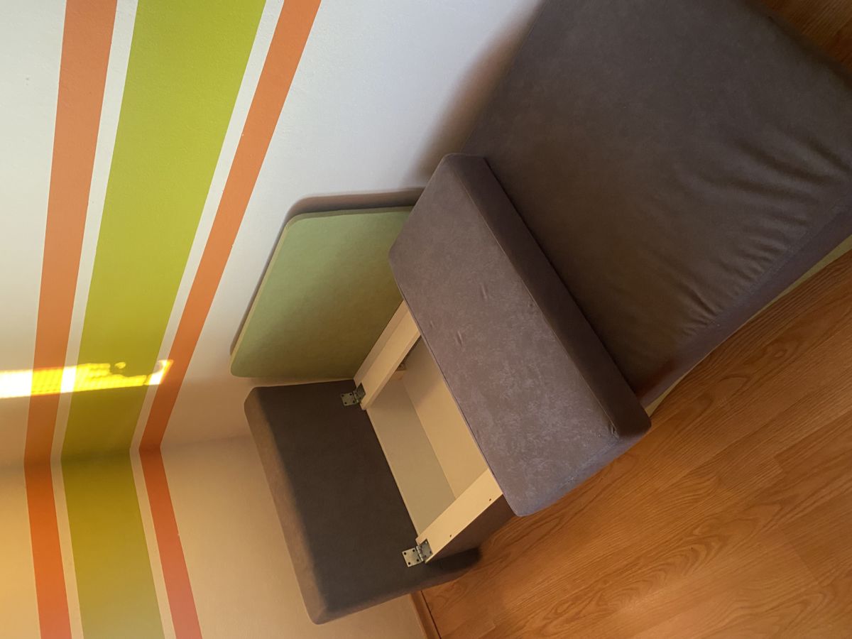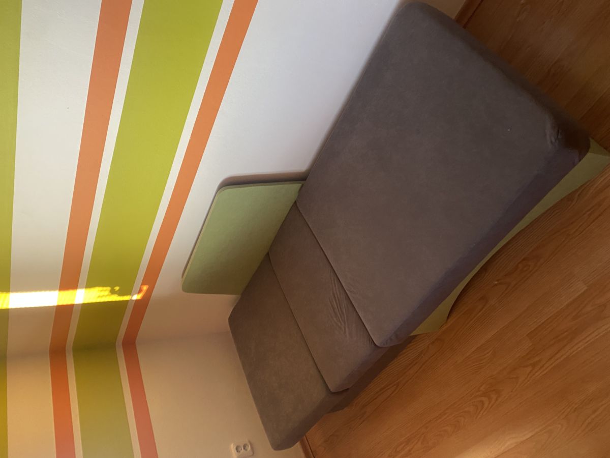 Prodám rozkládací křeslo.Rozměry rozložené: délka 180 cm,šířka 80 cm,nerozložené: délka 97 cm,šířka 80 cm. Barva šedo-zelená. Opěrka na levé straně, s úložným prostorem.Top stav.Cena dohodou.