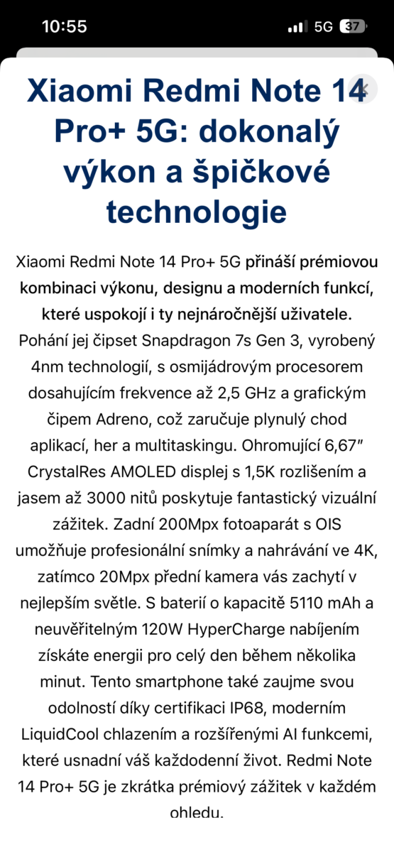 Prodám mobilní telefon zn. Xiaomi Redmi Note 14 Pro+ 5G 8GB/256GB Black. Telefon byl zakoupený v červenci 2025 (telefon je tedy v záruce) Doklad o koupi přidám k telefonu. Na tel. je aplikovaná ochranná fólie. Telefon je plně funční a bez škrábanců. K telefonu přidám 4 kryty a rychlo nabíječku 120 W. Důvod prodeje – přechod na jinou značku 🙂