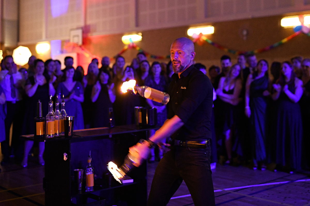 Po asi jedné delší taneční rundě došlo na další vystoupení. Opět ze Zlína přijel v Janové již známý a stále velmi oblíbený Jakub Orel z Barmani Zlín. Jako skvělý barman nepotřebuje mnoho rukou, protože všechny láhve poletují ve vzduchu. Obecenstvo, tentokrát především ženy, aby se to hezky vyvážilo s předchozí nabídkou, se postavilo do půlkruhu kolem minibaru a začalo výskat, ještě než Kuba promluvil. A pak již moc nemluvil, jen předváděl barmanské umění. Několik šťastných žen se stalo majitelkami v přímém přenosu vyrobených likérů, o které se samozřejmě podělily s dalšími přihlížejícími. Vrcholem programu bylo ohnivé zakončení celé show. Ještě, že má sportovní hala vysoký strop.