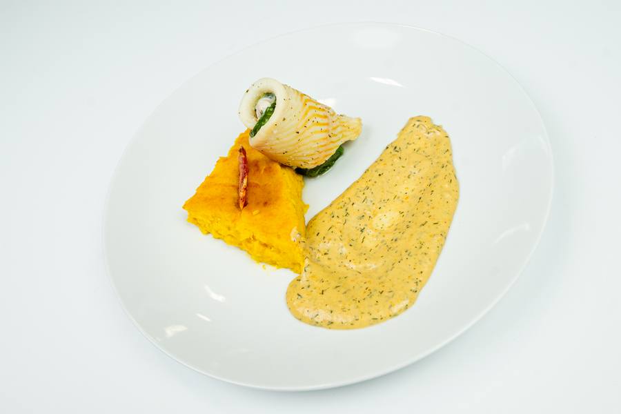 – Limanda drsná plněná lososem a baby špenátem, bramborový flan s mrkví, koprový přeliv,