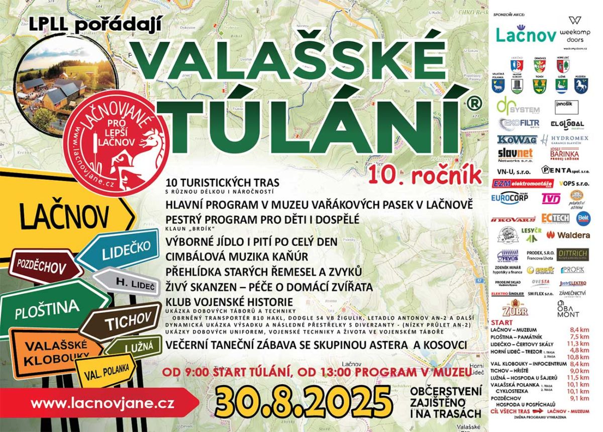Pořádající spolek Lačnovjané pro lepší Lačnov letos připravuje již desátý, jubilejní ročník oblíbené kulturně-turistické akce Valašské túlání. V sobotu 30. srpna 2025 zavítejte do Lačnova. Každým rokem se rozšiřuje výběr nabízených turistických tras a zároveň narůstá počet aktivních účastníků akce, důkazem je více než tisícovka návštěvníků v posledních letech.
