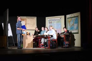 Úplně první, kdo dostal v úvodních vteřinách hry hlavní roli, byl asi nejodpornější lidský vynález budík a jeho ještě hrůznější funkce budit nás celý život z krásných snů. A pak už se děj rozjel na plné obrátky. Na jevišti se střídaly školní předměty, ale především vynikaly, protože se jedná o komedii, nešvary žáků. Jak už to bývá, největší zlobři obsadili zadní lavice. Podle toho se také jmenovali. Holčička Kazi, na první pohled andílek s kukadly plnými pokory, ale jen než jste se otočili zády. Pak se na scéně objevil malý ďábel. Zato Kazimír, habán, který musí mít vždycky poslední slovo a mnohdy slovo tak vtipné, že i učitelé se museli smát pod vousy, když mu psali další poznámku. Úžasná fiflena Šarlota, která nastavila zrcadlo něžné části hlediště, jak to mnohde po ránu vypadá u nich doma. Rázný otec myslivec, trochu hysterická maminka divadelní i doopravdická, již bez přívlastku hysterická, maminka divadelní tělocvikářky a ještě navrch si zahrála kuchařku. Nechyběl docela hustý černý humor, kdy mnohým doslova spadla čelist, protože již zapomněli na svá léta ve školních lavicích, jak si sami dovedli utahovat z velikánů historie.