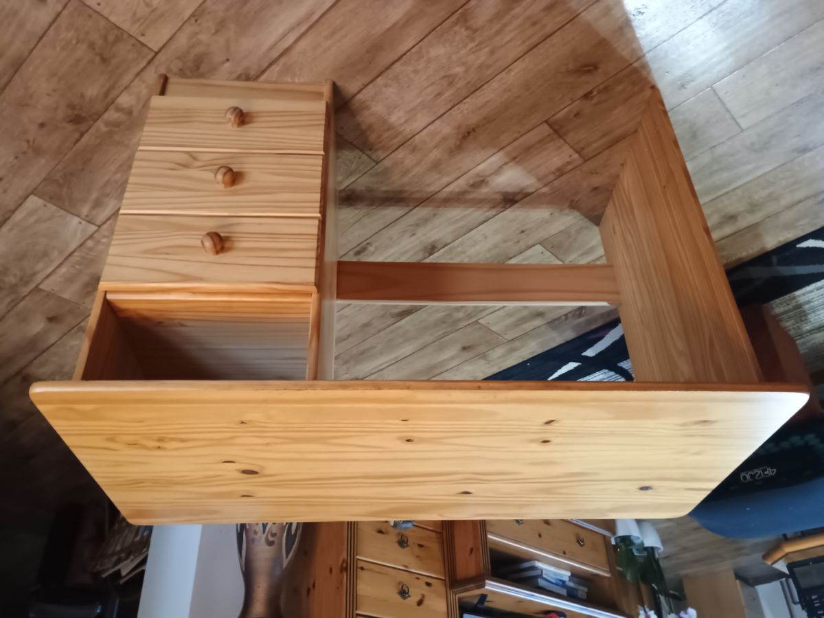 Prodám psací stůl z masivu borovice. Stůl se používal, mírné poškození viz foto. Délka 110 cm, hloubka 54 cm, výška 74 cm. Šuplíky šířka 33 cm. Cena 500kč