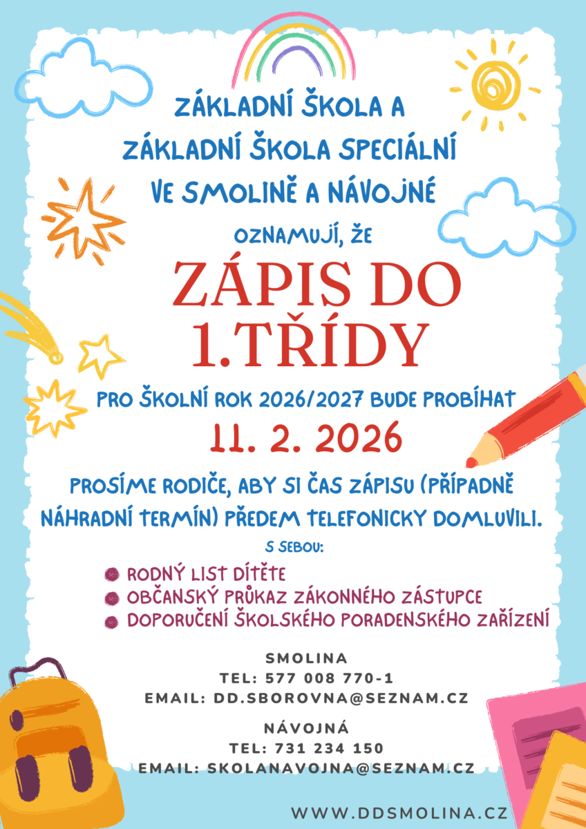 | 11.02.2026 | Smolina a Návojná | Zápis do 1.třídy ZŠ a ZŠ speciální ve Smolině a Návojné |