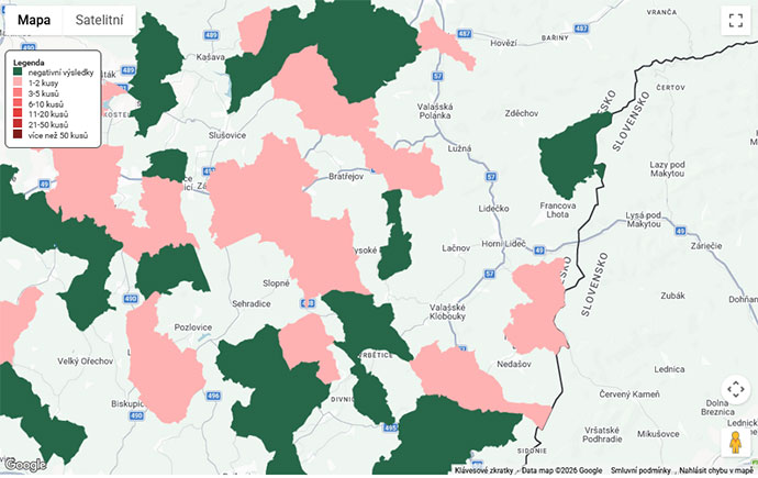 Nákaza byla v rámci monitoringu zaznamenána také na Valašsku, konkrétně například v katastrech obcí Pozděchov, Újezd, Študlov, Nedašova Lhota nebo Ústí u Vsetína.