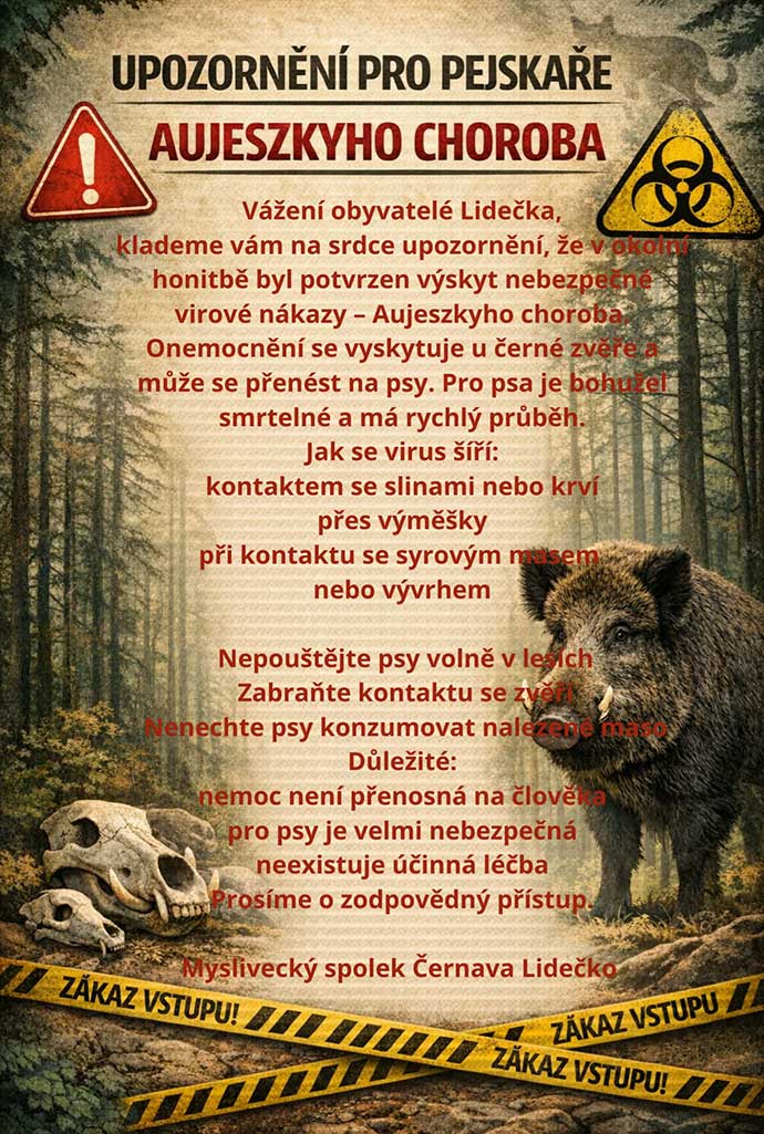 Myslivecký spolek Černava Lidečko upozornil na výskyt nebezpečné virové nákazy v okolních honitbách. Aujeszkyho choroba byla potvrzena u černé zvěře a představuje vážné riziko především pro psy. Podle odborníků ale není důvod k panice.