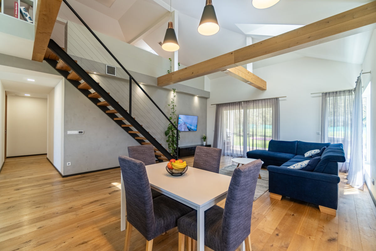 Interiér propojuje přírodní třívrstvá dubová podlaha v hlavních obytných prostorech a plovoucí podlahy v pokojích – teplé, odolné a nadčasové řešení pro každodenní komfort.