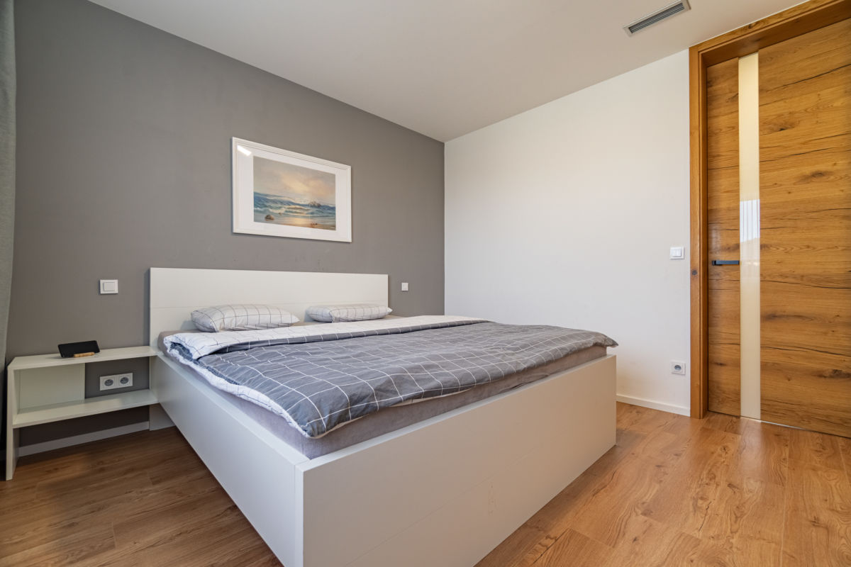 Soukromou část domu tvoří ložnice s vlastní šatnou a dva neprůchozí dětské pokoje. K dispozici je samostatné WC a luxusní koupelna s volně stojící vanou, sprchovým koutem a dvěma umyvadly.