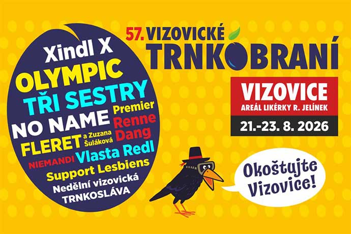 VIZOVICE – Festival Vizovické Trnkobraní odtajnil program nadcházejícího 57. ročníku. O prázdninovém víkendu 21. až 23. srpna 2026 zahrají v areálu likérky Rudolf Jelínek ve Vizovicích Olympic, Tři sestry, No Name, Xindl X, Support Lesbiens, Premier, Fleret se Zuzanou Šulákovou, Vlasta Redl nebo Renne Dang, čerstvě oceněný jako Objev roku na Českých slavících. Doplní je známé regionální kapely, místní soubory a pestrý doprovodný program v čele s legendární Velkou cenou v pojídání trnkových knedlíků.
