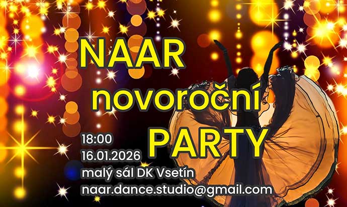 NAAR novoroční párty, tedy přehlídka orientálních tanců, proběhne na Vsetíně celkově potřetí. Pro svůj úspěch je zde opět pozvánka na sólová a skupinová vystoupení dne 16. 1. 2026 v 18:00 hod. v malém sále Domu kultury Vsetín.
